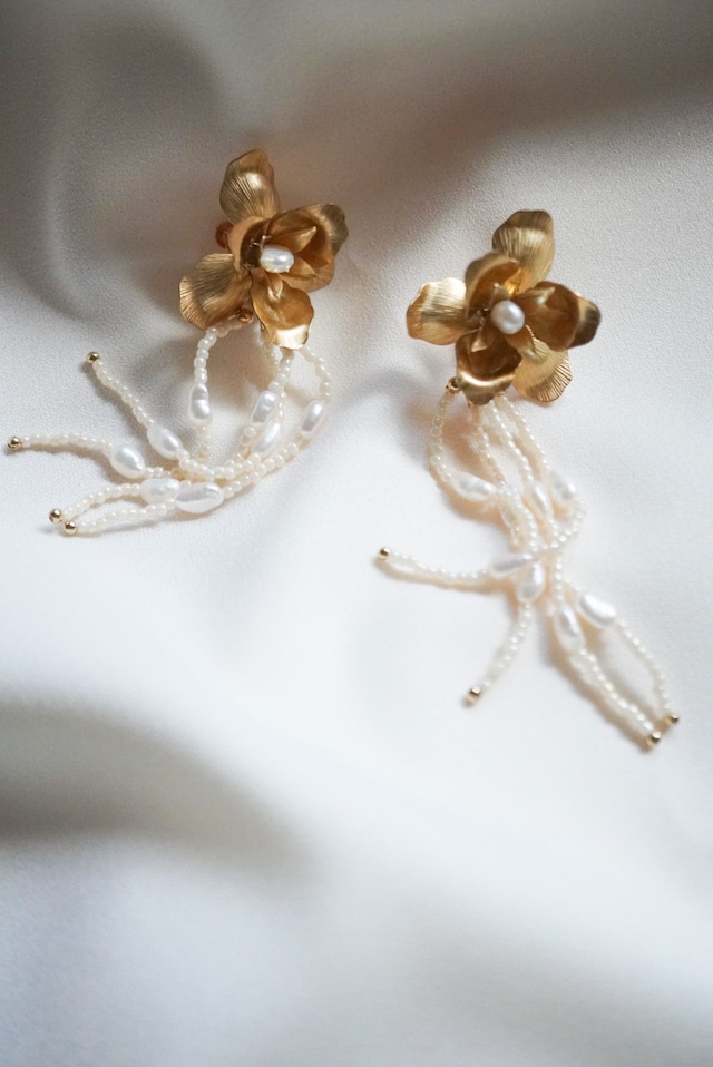 海外から取り寄せたパーツにビーズとパールのタッセルを組み合わせたアイテム。